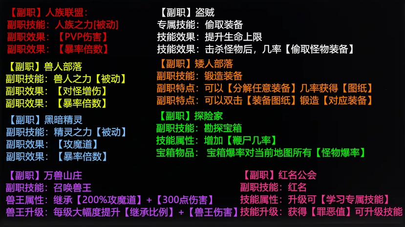 十大副职:人族★兽族★精灵★万兽山庄★红名公会★矮人部落★盗贼★探险家★赏金猎人★炼金师